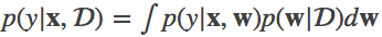 On the right hand side, we have an integral. The middle term inside the integral is the posterior, which is a probability distribution of the weights GIVEN we have seen the data.