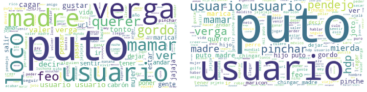 In the Facebook Comments dataset, the content has more variations for both hate speech and no hate speech categories. In the first one, among the most frequent words appear terms with negative connotations such as “feminazi” and “pinche”. Whereas in the second one, among the most frequent words appear terms related to gender equality discussions such as “igualdad” and “derecho”.
