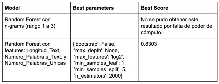 - Use of the RandomizedSearchCV technique to find the best parameters in Random Forest, using n-grams and the additional features. The following table shows the score results we got with this experiment: