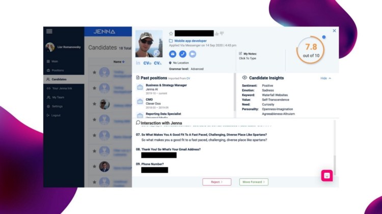 The platform interacts textually or vocally by using NLP/U with potential job candidates. It gathers the relevant information about each one and then predicts if they’re a good fit. Jenna also conducts fully autonomous decisions to filter irrelevant candidates.