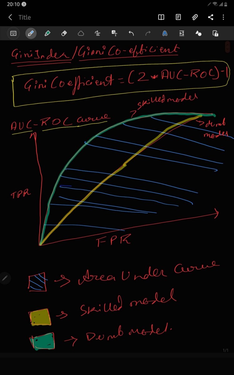 Gini Coefficient is an indicator of how well the model outperforms random predictions or mean prediction. As we have calculated the AUC-ROC in Part-3 metric evaluation. Gini Index is derived from the AUC-ROC curve.It can be also defined how the model exceeded random predictions in term of the ROC.