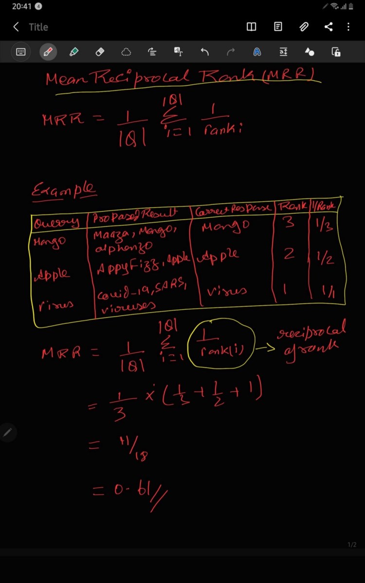 Mean Reciprocal Rank is a measure to evaluate systems that return a ranked list of answers to queries. This is the simplest metric of the three. It tries to measure “Where is the first relevant item?”. It is closely linked to the binary relevance family of metrics.For a single query, the reciprocal rank where rank iis the position of the highest-ranked answer If no correct answer was returned in the query, then the reciprocal rank is 0.