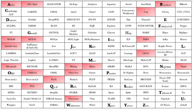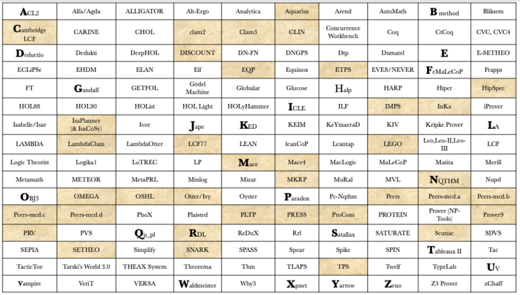 Even if I say those names are indices into strategies and tactics for theorem proving such as graph based resolution, induction, model generation, proof planning, semi-automatic interactive interfaces, programmability, intuitionistic predicate logic, multi-valued logic, constraint solvers etc. I wouldn’t be adding much value as they’re still just names, perhaps a tad bit more descriptive.