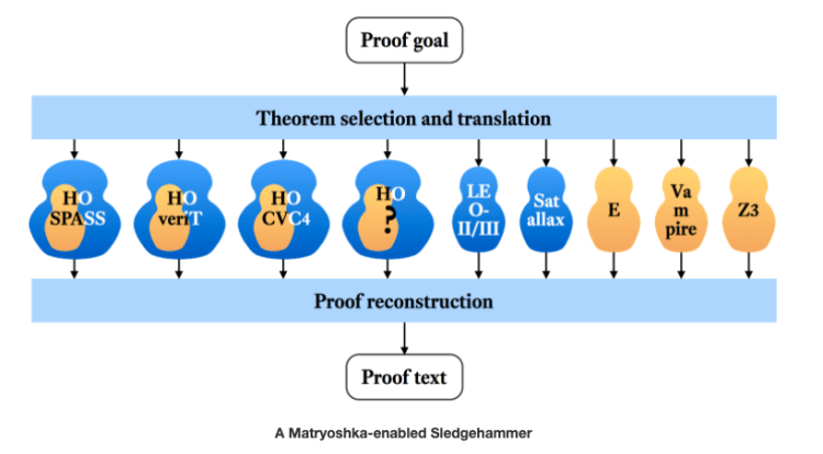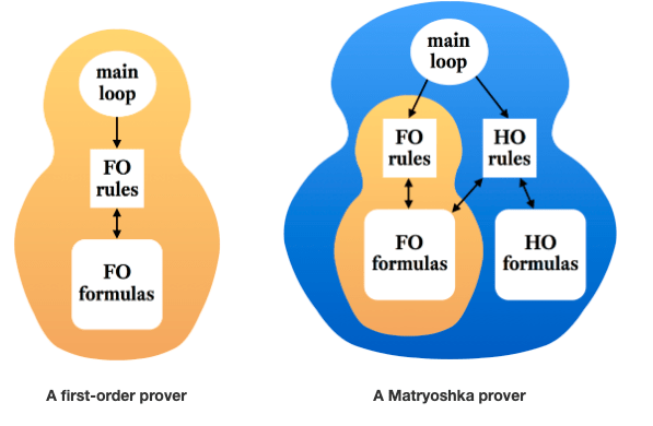 Matryoshka fuses two lines of research — Automated Theorem Proving and Interactive Theorem Proving. These systems are based on the premise that first-order (FO) provers are best suited for performing most of the logical work but they go on to to enrich superposition (Resolution+Rewriting) and SMT (Satisfiability Module Theories) with higher-order (HO) reasoning to preserve their desirable properties (Figure-42 and Figure-43)