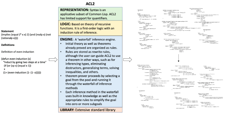 ACL2 (“A Computational Logic for Applicative Common Lisp”) is a software system consisting of a programming language, an extensible theory in a first-order logic, and an automated theorem prover.