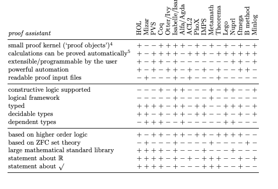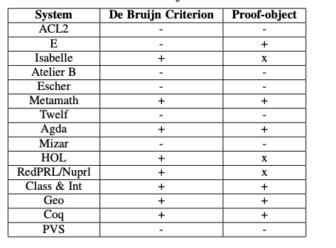 Here’s a comparison (Figure-52) of the 17 provers from Freek’s paper. A “+’ means its present and a “-” that it is not.
