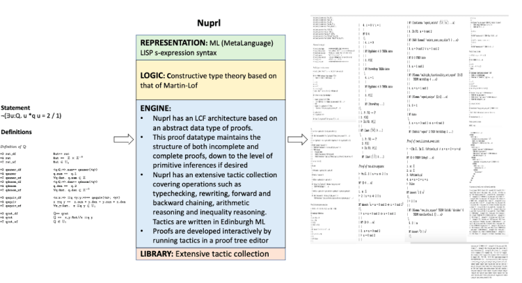 As shown in the above sections, even among just these 17 provers some use higher order logic, first order logic and ZFC set theory while others use Tarski-Grothendieck set theory which is a non-conservative extension of ZFC that includes the Tarski’s axiom to help prove more theorems. Some use Hilbert-style axiomatic systems while others use Jaskowski’s system of natural deduction where proofs are based on the use of assumptions which are freely introduced but dropped under some conditions. Some use classical logic systems while others use intuitionistic or constructive logic which is a restriction of classical logic wherein the law of excluded middle and double negation elimination have been removed. And one uses LUTINS (Logic of Undefined Terms for Inference in a Natural Styles), a variant of Church’s simple type theory