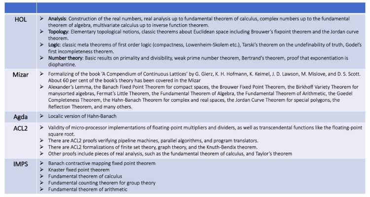 In the tables below (Figures 33–35), we can see an impressive list of formalizations from some of the above provers.