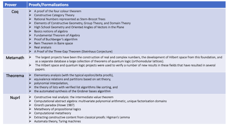 - Landscape: We saw a huge dump of 160 efforts out of which we looked at 17 provers with some of their proofs. We further looked at the architectures of a handful of provers noting the emerging complexity of software systems.