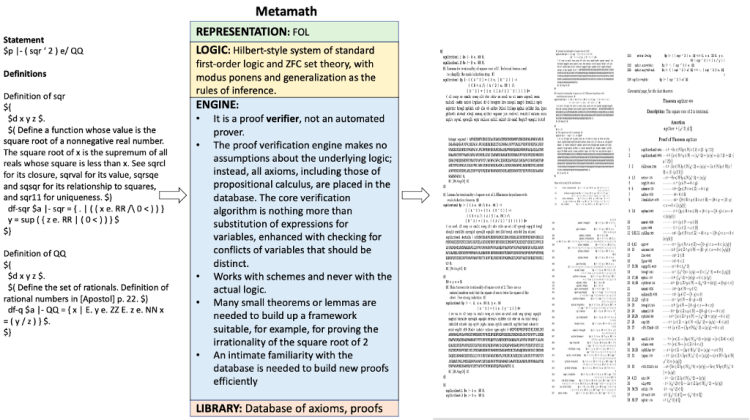 Do you have to go through all 17 provers? Not necessary. But if you’re curious, it can be interesting. My suggestion would be to skim through the notes in the centre table and just glance at the input and output to get a sense of what the machines take in and spit out. In some of the provers further down, the proofs are too long (like IMPS, Metamath, Nuprl) to even print here so they’ve been compressed to fit the template and will be hard to read anyway. I still wanted them in here to give readers a sense of the formats and readability. If after a few it seems overwhelming feel free to jump ahead to the accomplishments section.