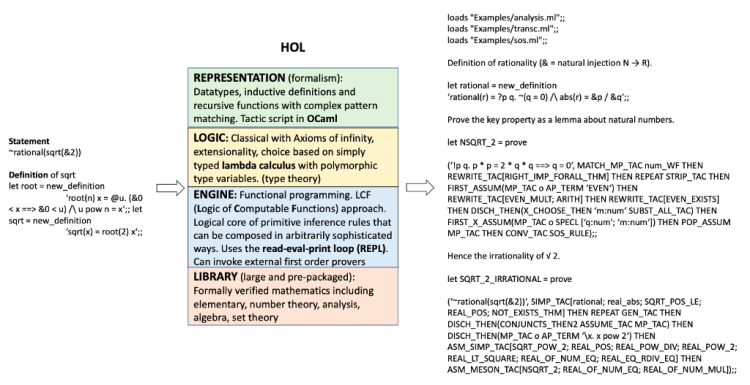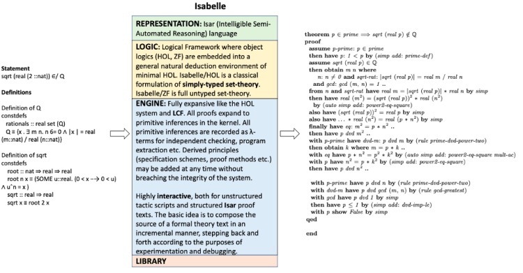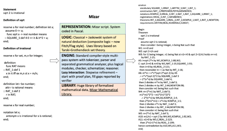But another compilation, a more interesting one is Freek Wiedijk’s “The Seventeen Provers of the World” in which he asked authors working on the top active (at the time — 2005) theorem provers to provide their machine proof for the same one problem — irrationality of sqrt(2).