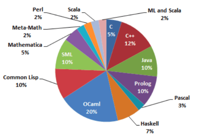 The same survey above also broke down the programming designs (Figure-48) and languages (Figure-49) across provers indicating that close to a quarter of the efforts use functional programming with OCaml as the choice of language.