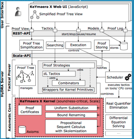 KeYmaera is a theorem prover for differential dynamic logic for verifying properties of hybrid systems (i.e. mixed discrete and continuous dynamics). Figure-44 shows three big parts to the system — the axiomatic core, the tactical prover and the user interface. The architecture gives us a sense of the multiple moving parts.