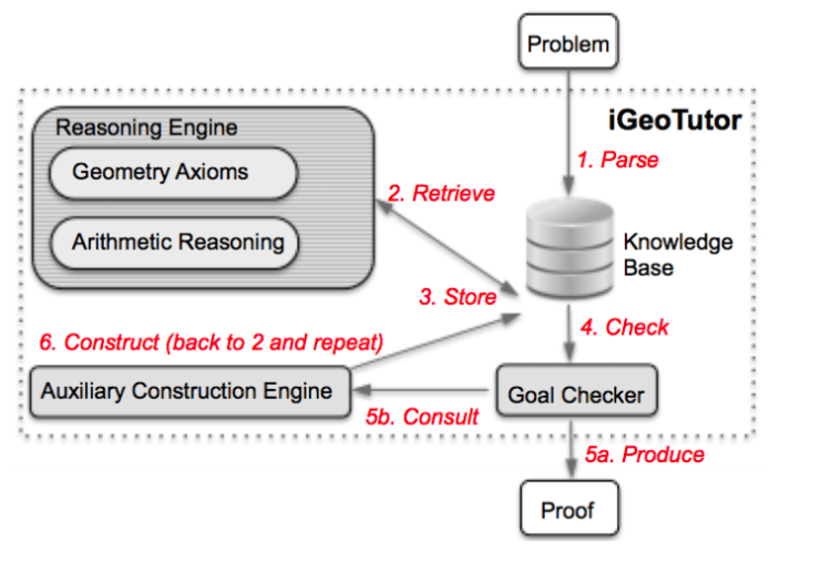 An important goal in efforts like iGeoTutor (See Automated Geometry Theorem Proving for Human-Readable Proofs, Figure-41) and GeoLogic is to generate more human readable proofs in geometry. GeoLogic is a logic system for Euclidean geometry allowing users to interact with the logic system and visualize the geometry (equal distances, point being on a line …). Here’s a detailed presentation by Pedro Quaresma on Geometric Automated Theorem Proving dating back to efforts in 1959 by H.Gelerntner (See Realization of a geometry-theorem proving machine)