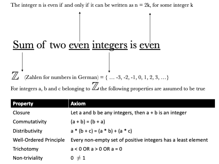 Prior knowledge in this example includes definitions and properties of integers some of which are assumed to be true i.e. axioms. Here’s what we know about integers (Figure-8)