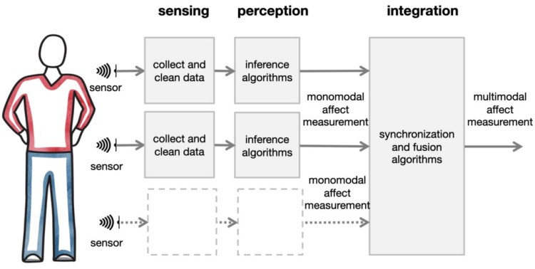 Computers can infer emotions from the data that we gather from one or more sources. They study the cues (body language, facial expressions, gestures, tonality of voice, physiological signals, and even brain activity) and infer an affective state. Figure 3 depicts the process. One sensor gather data from one source, machine learning algorithms are applied to the collected data to infer an affect measurement (perception process). But, multiple monomodal measurements can be synchronized and fused (multimodal affect recognition).