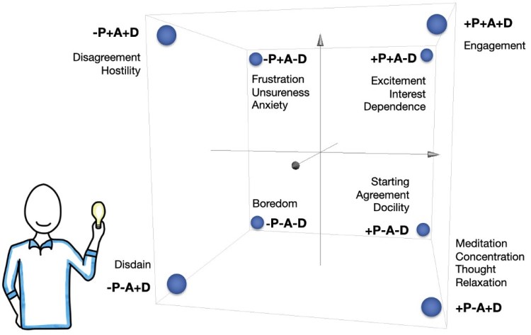 Ok, what about affect? Well, think about a similar 3D space where the axis are Pleasure, Arousal, and Dominance instead of Red, Green, and Blue. And, let us limit the possible values in each axis to be a decimal number between -1 to 1. Each dot in the space represents an affective state.Now, let’s give names to some of the dots in that 3D space, for example, as shown in Figure 2, [1,1,1] is complete Engagement, [1, 1, -1] is complete Excitement, [-1, -1, -1] is total Boredom, [-1, 1, -1] is complete Frustration, and so on. These names are what we identify as emotions. However, as happens with colors, not all affective states have a name. Not all of them are what we identify as an individual emotion. Maybe, because we do not have a name, we think about them as a combination of the names that we know. Just like considering Magenta a color or just a combination of Red and Blue. ?