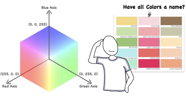 Let us review an analogy using colors. Any color in a screen computer is a combination of Red, Green and Blue (RGB), right? R, G and B are the axis of a 3D space in which all color can be located. And, we limited the value for each axis to range only, for instance, from 0 to 255. Then, we could present colors as a combination of red, green, and blue as shown in Figure 1. Thus, a color is a vector such as [248, 114, 23] and some colors have names such as [248, 114, 23] is the Pumpkin color.