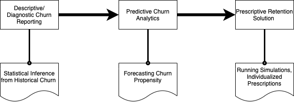 Based on this initial assessment, the team recommends a data driven retention solution which uses machine learning to identify the reasons for churn and possible measures to prevent it. The solution consists of an array of sub-solutions focused towards specific areas of retention. The first level of sub-solutions consists of insights that can be directly derived from the existing customer data, answering for example the following business questions: