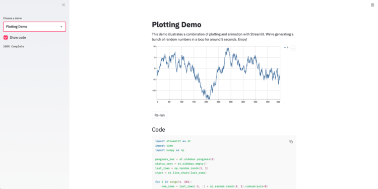 Running it will open up the hello file in your web browser. You can choose from a number of pre-built streamlit examples. Here I have chosen the plotting demo and the plotting happens in real-time.
