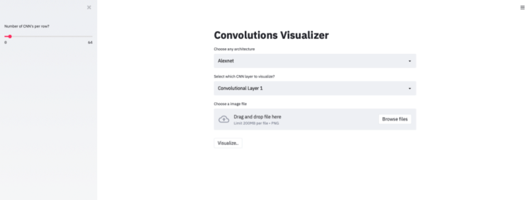st.file_uploader() helps us upload any image file to our streamlit app. We check if the file is uploaded or not. We also make a slider using st.sidebar.slider() that helps us select number of convolutions per row to display as output. st.button(“Visualize”) is the button that we intend the user to press and get the results.