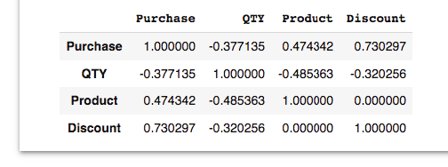 We can see that there is a very strong relationship between these two features(Purchase and Discount), about 0.7 while the other features have very less correlation -0.3 and 0.47.