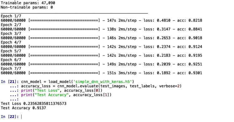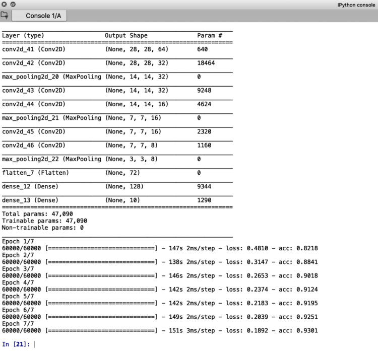Compiling and training the model in Keras is done in two lines: model.compile(optimizer='adam', loss='categorical_crossentropy', metrics=['accuracy']) model.fit(train_images, train_labels, batch_size=32, epochs=7) model.save('simple_cnn_with_keras.h5') del model