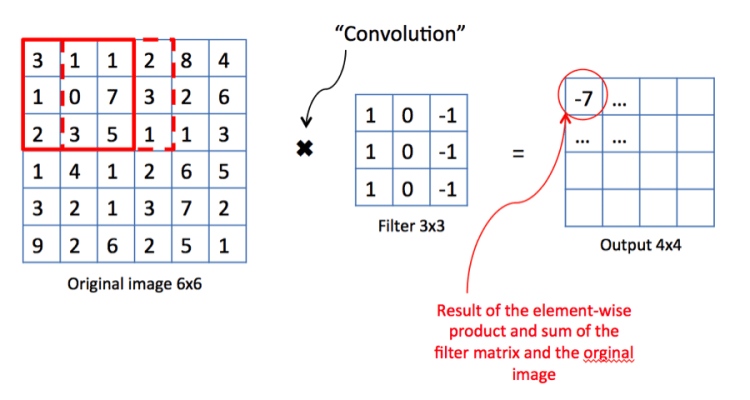 We start in the upper lefthand corner by placing the lefthand corner of filter on the underlying image and taking a dot product as shown in the graphic above. We then move the filter across the image step by step until it reaches the upper righthand corner. The size of the step is known as stride. Stride is a hyperparameter because we can move the filter to the right one column at a time, or we can choose to take larger steps. At each step, we take another dot product, and we place the results of that dot product in a third matrix, the output matrix or the activation map, the first alien term.