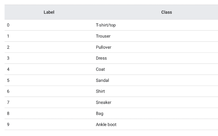 The train_images and train_labels arrays together are the training set which we will use to train the network and the test_images and test_labels arrays are on which we will evaluate the performance of our model. The labels and their classes are given as follows: