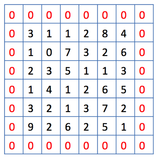 A solution is a use of “padding”. Before we apply a convolution, we pad the image with zeros all around its border to allow the filter to slide on top and maintain the output size equal to the input. The result of padding in the previous example will be: