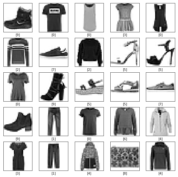 import matlplotli.plyplot as plt plt.figure() for i in range(25): plt.subplot(5,5,i+1) plt.xticks([]) plt.yticks([]) plt.grid(False) plt.imshow(train_images[i], cmap=plt.cm.binary) plt.xlabel([train_labels[i]]) plt.show()