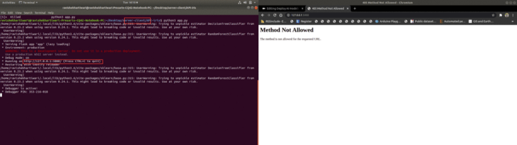 The left side is client script where it shows the predicted class i.e. Versicolor with response 200 which means the APIis working fine.