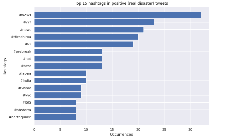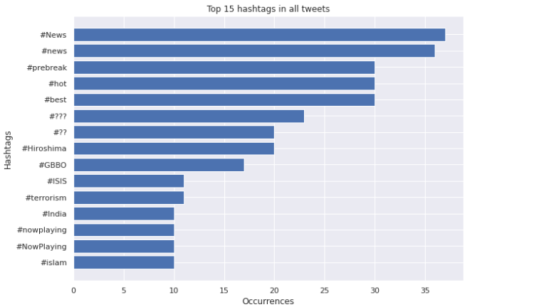 Subsequently, what I wanna do is to count the number of all unique hashtags and sort them such that the most common word appears at the bottom of the series. In addition, I will only keep the first 15 most commonly used hashtags.