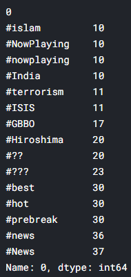 Next up, I wanna find all hashtags that appear in the entire dataset and count all of those. Furthermore, the most positive and negative hashtags will also be displayed. In order to do that, we need to define a function called find_hashtags() which will be applied to the the text column of the data frame. The return value of this function is a list containing a word started with “#” symbol. The findall() function taken from Regex module works well for that. It’s worth noting that the regular expression that I write in bold below basically matches all words started with “#” and followed by one or more characters except whitespace.
