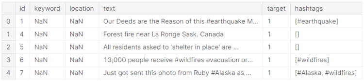 Now as the function for finding hashtags has been defined, we can just apply it to text column and directly store the array of hashtags in a new column.