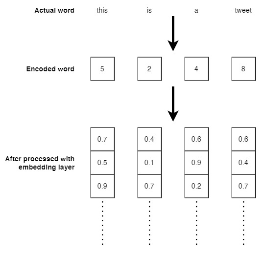 Subsequently, this input layer is connected to an embedding layer which takes 3 arguments, namely input_dim, output_dim and input_length. We can see here that vocab_size that we defined in the feature engineering chapter is used as the value of input_dim argument. What’s essentially done in this stage is that we are going to put every single unique word into a 32-dimensional space such that similar words in the dataset will be placed closely to each other in that high dimensions space. In other words, a single word will be represented with 32 features. Here’s an illustration of how the output of embedding layer looks like. Note that the values used here is not the actual numbers.