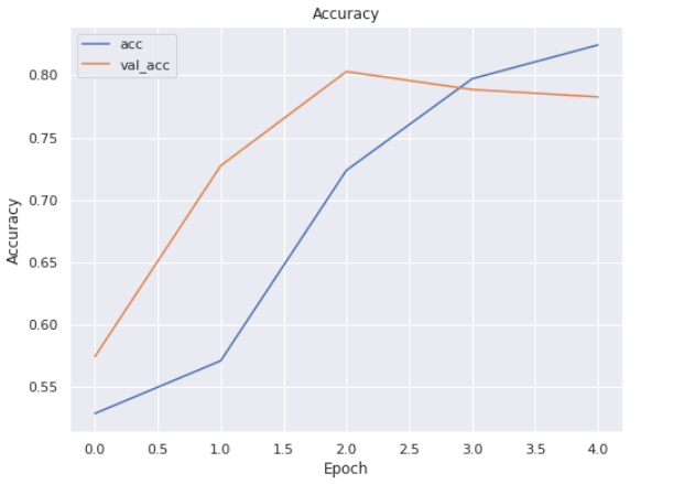 We can see here that the final accuracy towards train data is 82.4% while the one towards test data is 78.2%. Well, the model quite overfitting though, but I think it’s not so bad. If you pay attention to the code above, you will see that I set the epochs to 100 yet eventually the training stops at fifth epoch thanks to the EarlyStopping object that we implement earlier.