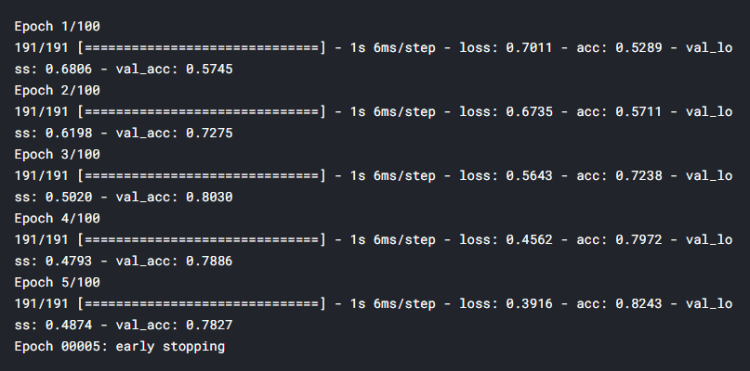 Now after the neural network has been constructed, we can compile it using binary cross entropy loss function along with Adam optimizer prior to the training process. Furthermore, I do also initialize an EarlyStopping object which is useful to terminate the training process once the model starts to overfit no matter how many epochs that we defined in the first place.