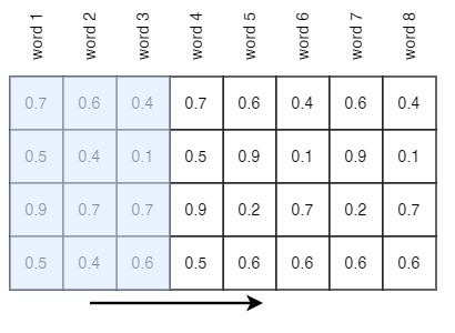 Afterwards, we connect this embedding layer to a Conv1D. In fact, the main idea of this layer is exactly the same as Conv2D which we commonly use in image classification task. What makes Conv1D different is just because its filters are moving along a single axis instead of two. Below is another illustration which shows how the filter (highlighted in blue) of 1 dimensional convolution layer strides. In addition, I’ll employ 32 different filters for this case (it’s probably an overkill though).