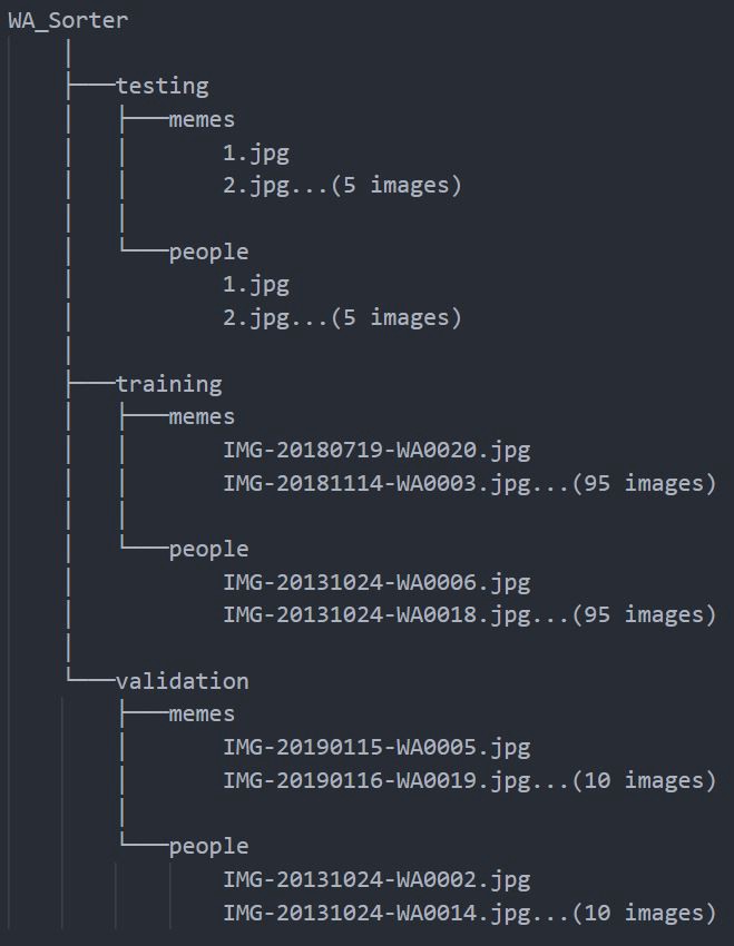With this project, I want to address a problem that all of us have: too many Whatsapp images and no way to sort them. As an initial experiment, I made a model that differentiates pictures of people from memes, so that they can be labelled or moved to be stored separately (currently working, hopefully there will be a part 2).