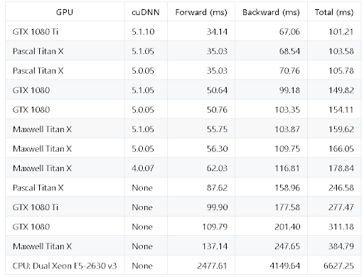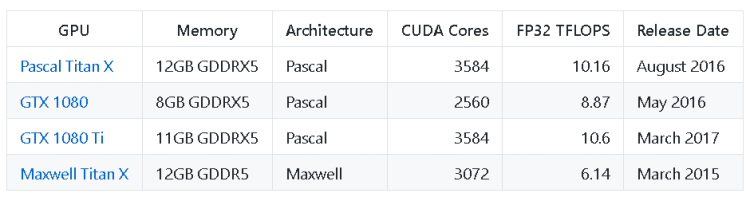 An older but highly popular and rigorously tested benchmarking exercise can be found in this open-source Github repo (there have been many GPU advances since then, with a new line from NVIDIA that blow away older GPUs in performance: RTX 3070, RTX 3080, RTX 3090).