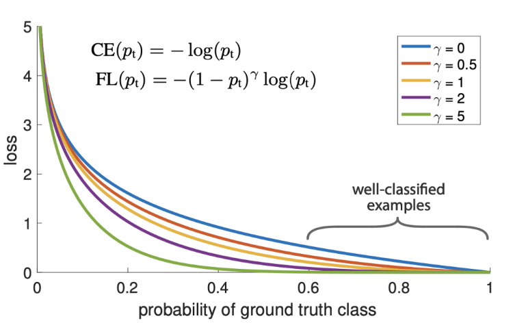 The new Focal loss function is based on the cross entropy by introducing a (1-pt)^gamma coefficient. This coefficient allows to focus the importance on the correction of misclassified examples.
