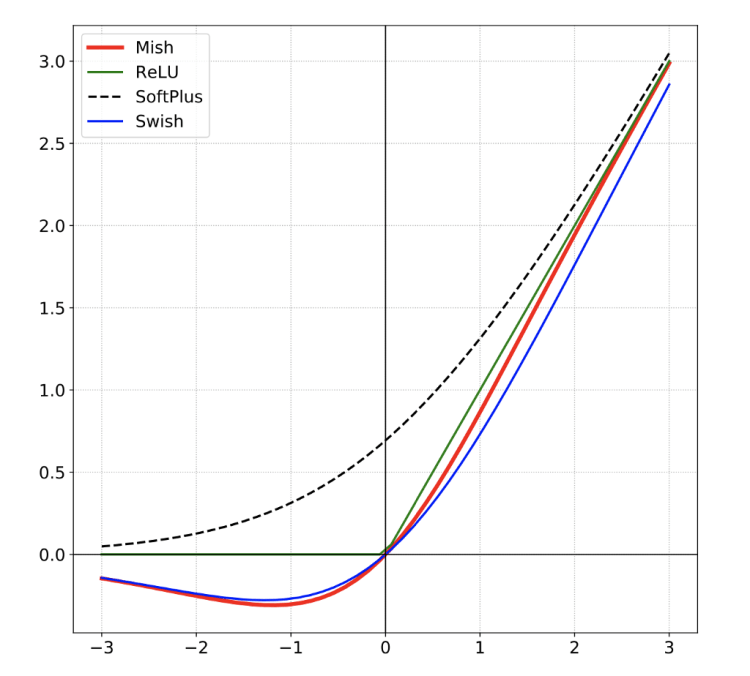 Mish is a novel self-regularized non-monotic activation function which can be defined by f(x) = x tanh(softplus(x)).