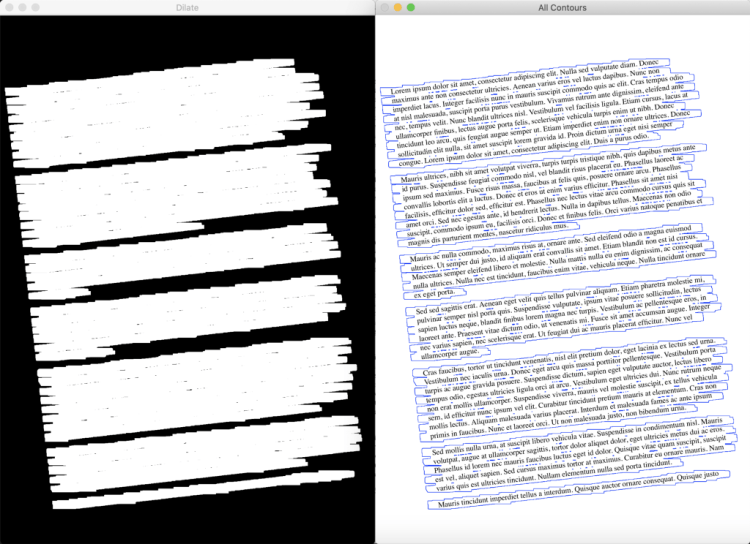 - To find text blocks we need to merge all printed characters of the block. We achieve this via dilation (expansion of white pixels). With a larger kernel on X axis to get rid of all spaces between words, and a smaller kernel on Y axis to blend in lines of one block between each other, but keep larger spaces between text blocks intact.