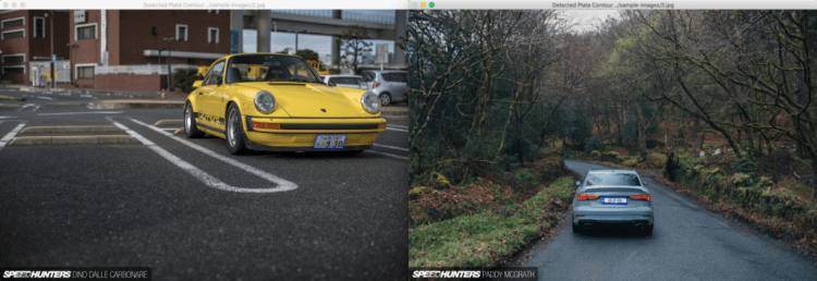 Let’s go though 2 more example images to make sure this approach is feasible. It seems to work fine for our purposes, even switching from Japanese to European license plate didn’t cause any issues.: