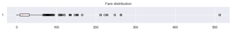 Here we see that the distribution is skewed to the right (a.k.a. positive skew) due to the fact that the longer tail is located at the right part of the box, where most of the data points are spread more densely at the range of approximately 10 to 35 currency unit. Additionally, outliers in the samples are represented by the circles. We can also see the fare distribution details using df[‘Fare’].describe() command, which the output is going to look something like this: