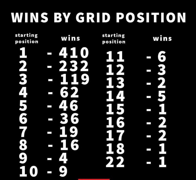 Some fans are using machine learning to make their own predictions, and others are building visual dashboards to see which factors are more likely to influence the results themselves. Now that the significance of qualifying positions has been identified, the likelihood of winning depending on starting place must be examined, given all other factors are equal — i.e. the driver qualifying first incurs no grid penalties.