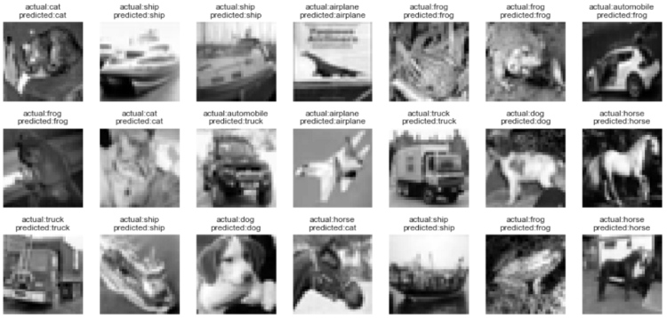 Well, the code above is done just to make Matplotlib imshow() function to work properly to display the image data. Since we will also display both actual and predicted label, it’s necessary to convert the values of y_test and predictions to integer (previously inverse_transform() method returns float).