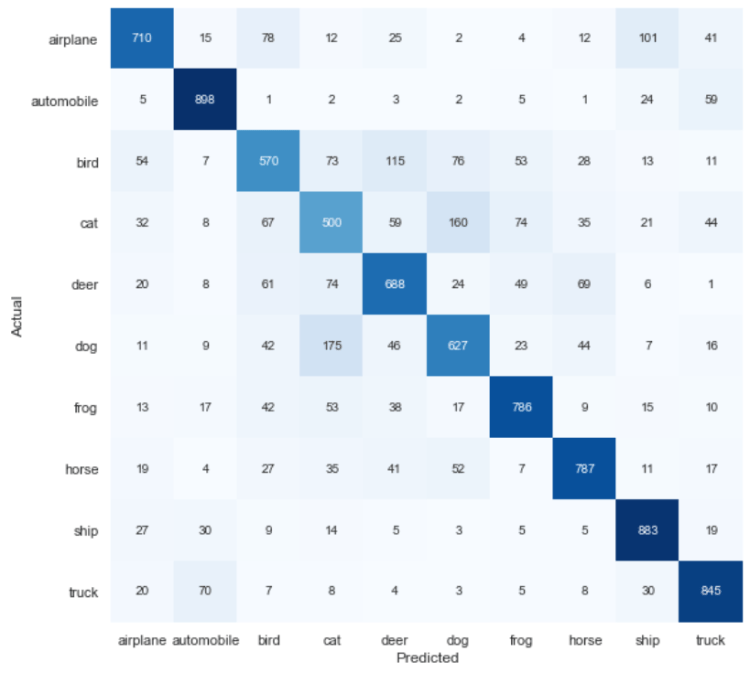 And here is how the confusion matrix generated towards test data looks like. We can see here that even though our overall model accuracy score is not very high (about 72%), but it seems like most of our test samples are predicted correctly. Here’s how to read the numbers below in case you still got no idea: 155 bird image samples are predicted as deer, 101 airplane images are predicted as ship, and so on.