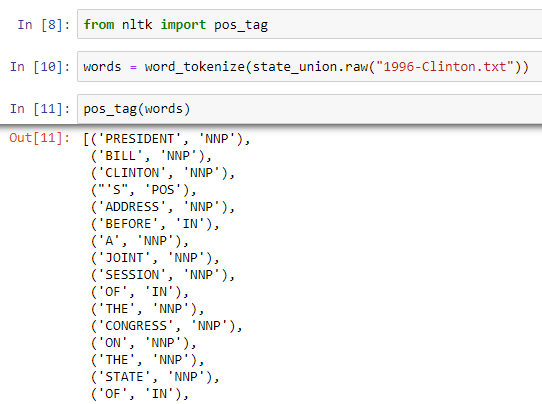 As you can see, the pos_tag function takes in word tokens as input and returns a list of tuples consisting of the word alongside the part of speech tag.